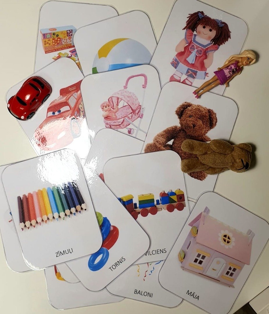 Materiāls vārdu krājuma papildināšanai. Tas izveidots par tēmu rotaļlietas.